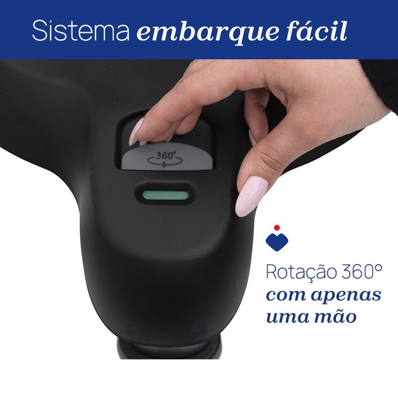 O grande diferencial é o inovador Sistema Easy-Boarding: com um simples giro de 90°, o bebê conforto se volta completamente para você! Isso transforma a rotina de colocar e tirar o bebê do carro em um verdadeiro prazer, sem esforço ou desconforto.