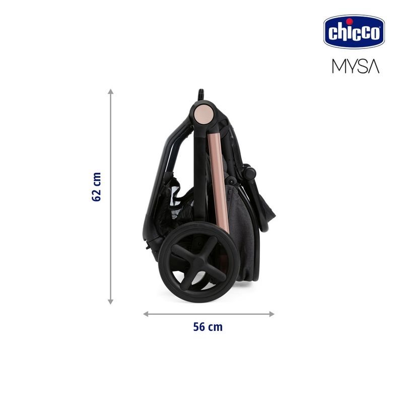 O carrinho Mysa pode ser convertido num sistema de viagem. Basta fixar os conectores Mysa Fast In (vendidos separadamente) e escolher entre as cadeiras auto Chicco Kory Air Plus i-Size, Kory Essential i-Size ou First-Seat Recline i-Size.